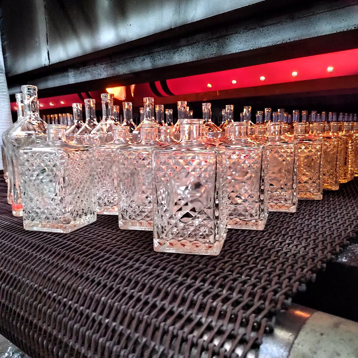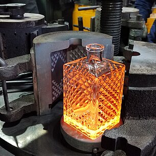 During production, glass is heated in a furnace that reaches 1600 degrees Celcius (2900 degrees Fahrenheit), until it becomes molten. The molten glass is poured into the customized mold to take shape. The annealing process of cooling the glass within the mold begins, in order to relieve it of any internal stresses, thus making it more durable. After the bottle has cooled, it is removed from the mold and sent to the finishing station.
